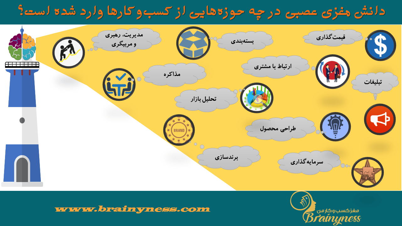 با مقدمه‌ای که گفتیم، احتمالاً می‌شه حدس زد تقریباً در تمامی زمینه‌های کسب‌وکار، این دانش حرف برای گفتن داره. دلیلش هم مشخصه؛ چون تمامی تصمیمات ما رو مغز میگیره. اما بطور مشخص‌تر اگر بخوایم صحبت کنیم، این دانش در چند زمینه مشخص خیلی پیشرفت کرده که در اینفوگرافی زیر میتونین ملاحظه کنین. البته نفوذ این دانش مطمئناً فقط محدود به این زمینه‌ها نیست.