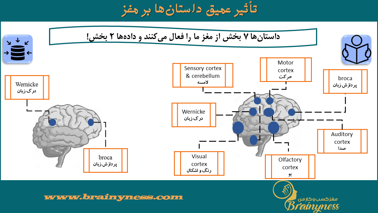 داستان در فرهنگ عامه و در ادبیات غنی ما روزی بسیار پررنگ بود و امروز متاسفانه نه. نه از این بابت که حس نوستالژی بهشون داشته باشیم (که البته هم داریم)، اما مهم‌تر از این بابت که همین علوم مغزی عصبی نشون میدن که داستان‌ها می‌تونن بسیار تأثیرگذار باشن و پیامشون خوب در ذهن مخاطب حک بشه. Story Telling روش روز دنیا برای انتقال مفاهیمه از جمله مفاهیم کسب‌وکار. از این بابت، سعی میشه آموزش‌ها طوری طراحی بشن که با زبان داستان، مخاطب دقیقاً مشکلی که بطور روزمره باهاش سر و کار داره رو ببینه و لمس کنه. دلیل این موضوع هم از نگاه دانش مغزی عصبی خیلی مشخصه. اینفوگرافی زیر رو یک نگاهی بندازین تا متوجه بشن داستانها چه میکنن با مغز.